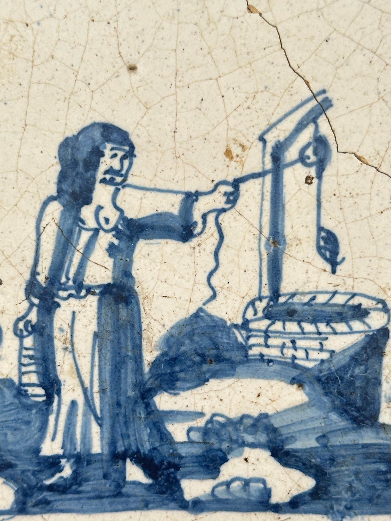 Tin-glazed earthenware tile painted in cobalt blue, set within a later brass frame with decorative paw feet at each corner. The central scene depicts a figure—strikingly rendered with a bearded face and feminine attire—drawing water from a well amid a simple pastoral landscape. The unusual iconography is framed within a sparse but expressive composition, with curling flora and stylized rocks occupying the lower foreground.