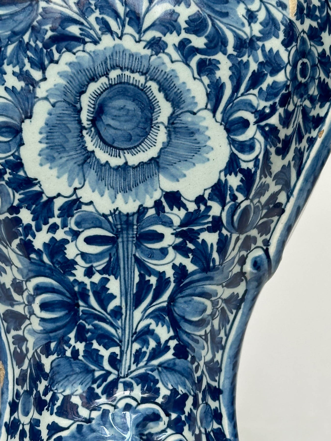 An impressive Delft faience vase attributed to the ’t Fortuyn factory, decorated in cobalt blue with a dense all-over floral design. The body is richly painted with large blossoms, scrolling foliage, and stylized cartouches, set against a bright white glaze ground, with the reverse displaying more restrained floral sprays.