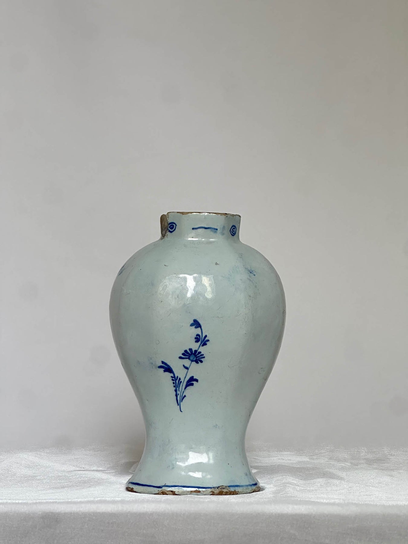 Chip to the rim, small chips in the base, with glaze losses and minor abrasions consistent with age. Small firing imperfections and surface wear typical of period Delft.