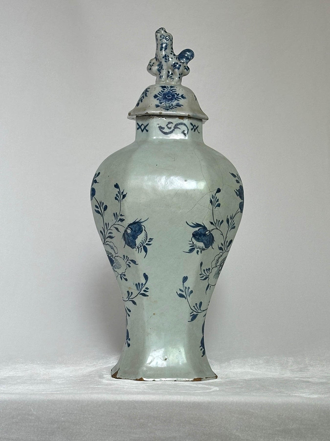 A finely modeled Delft lidded vase, decorated with a pastoral village scene framed by scrolling cartouches, with complementary floral sprays on the reverse. The domed cover is surmounted by a lion finial, and the surface shows areas of historic wear consistent with age and use. The piece retains a warm patina and the distinctive character of early Delftware.