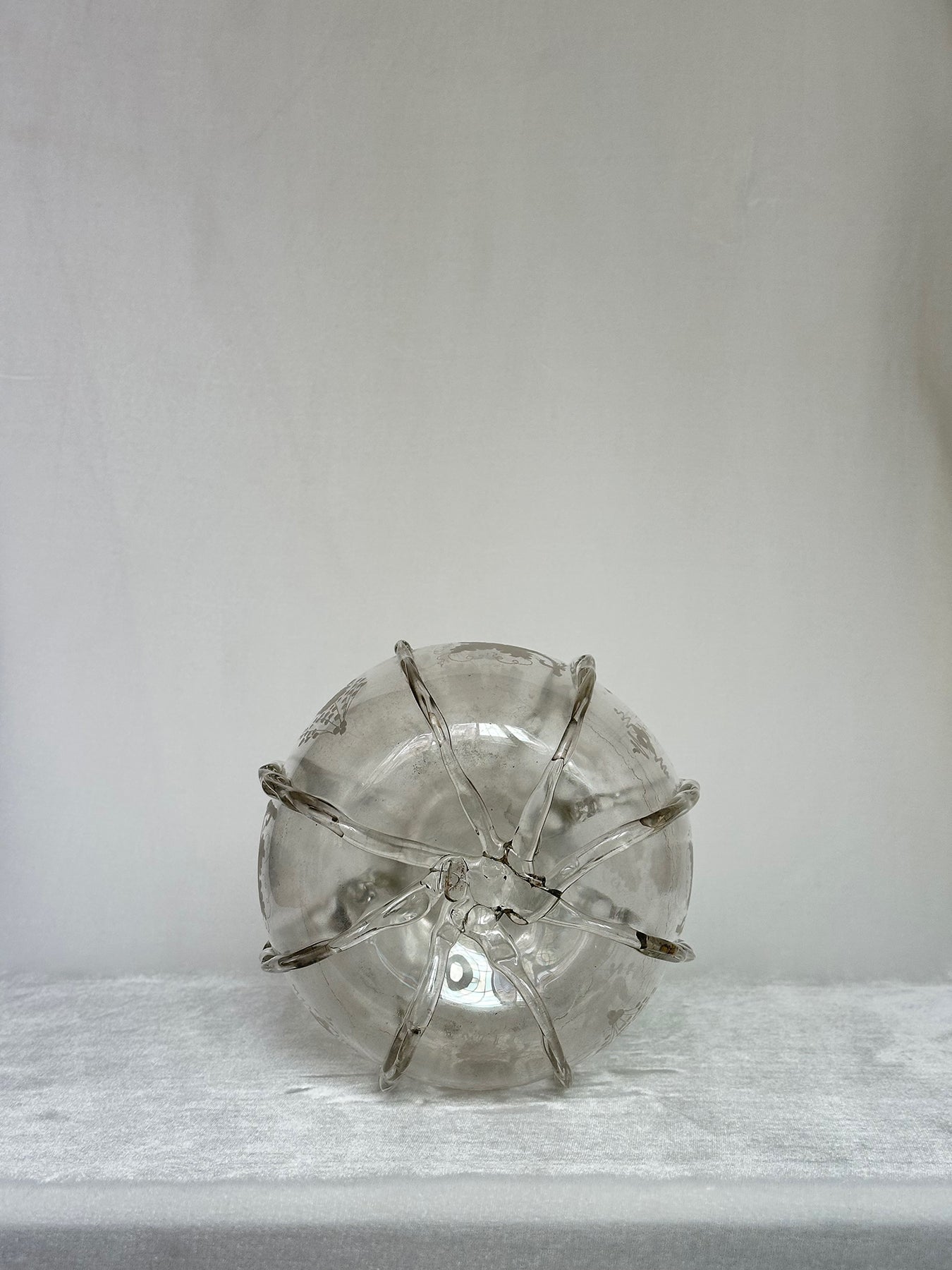 This example reflects a less common form in Dutch glass of the period, combining both engraved decoration and applied sculptural elements—a combination more typically seen in Central European production. The presence of both applied handles and ribbing, along with its gourd-shaped body, distinguishes it from the more frequently encountered cylindrical or onion-shaped Dutch decanters of the 18th century. Originally intended for serving wine or spirits, it would have also served as a decorative object on the table, reflecting both refined taste and skilled craftsmanship.