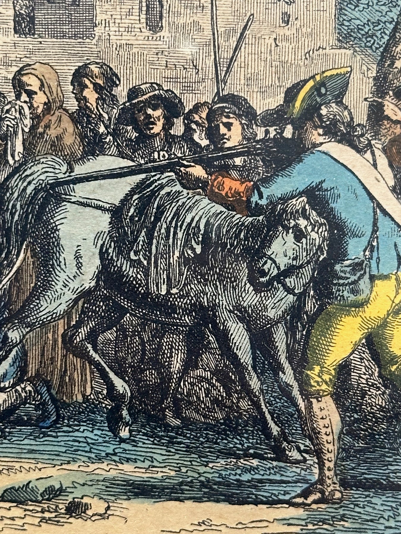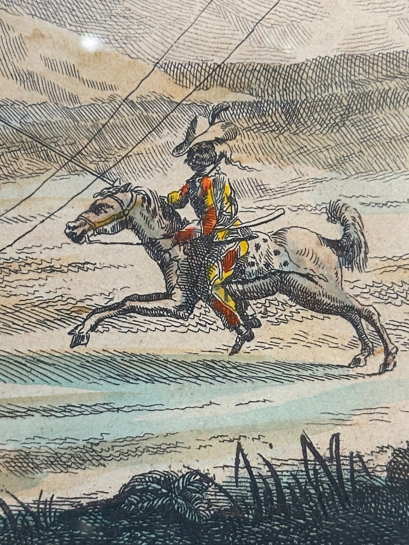 An equally absurd ‘solution’ to balloon steering shows horsemen galloping across the countryside while dragging the airborne pilot along behind them.