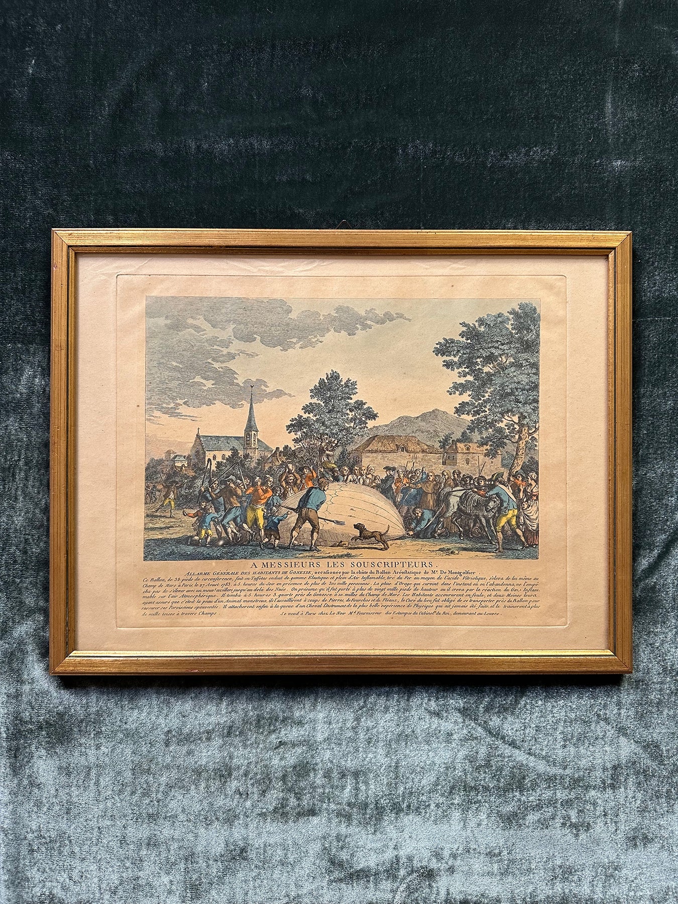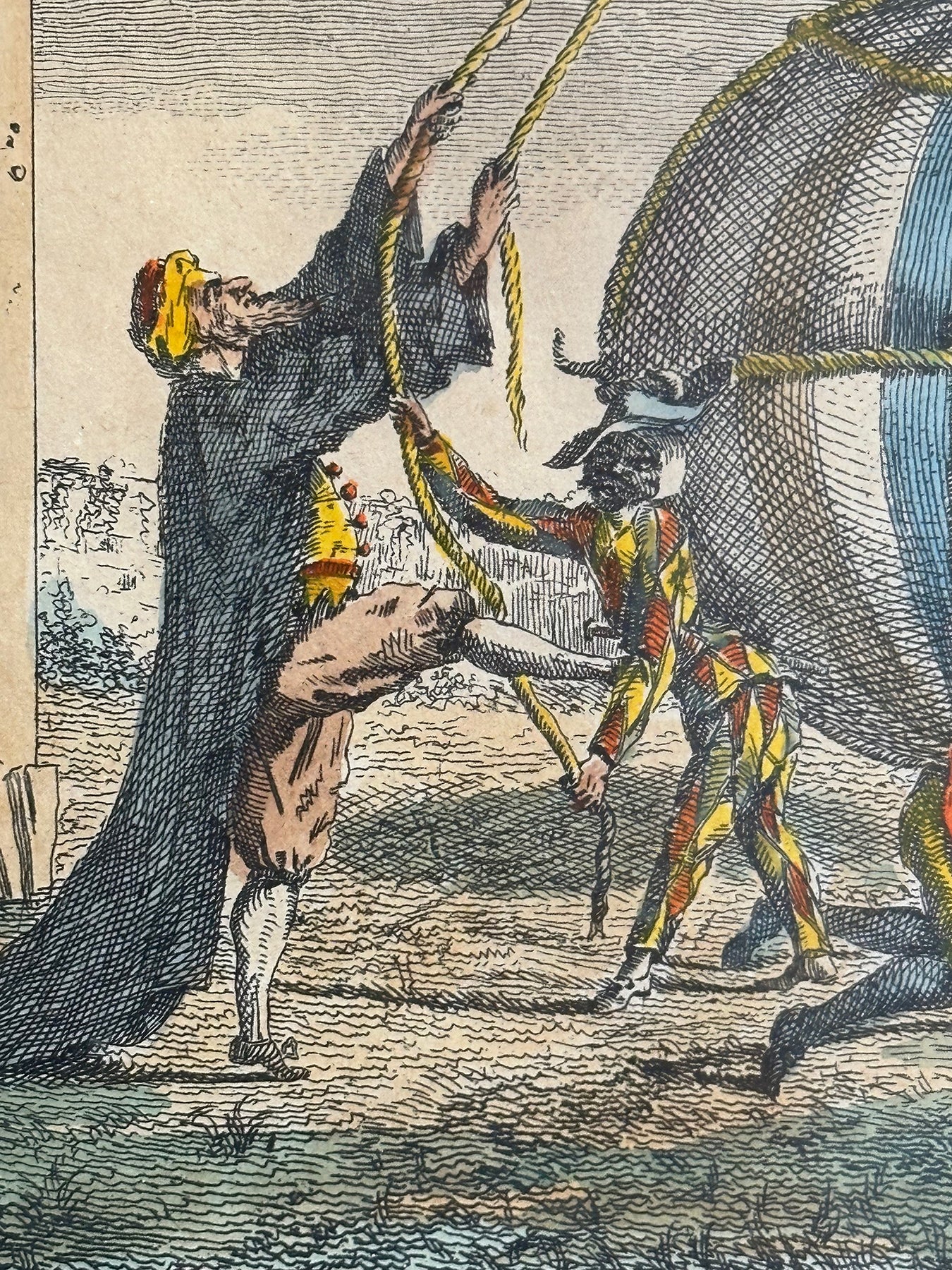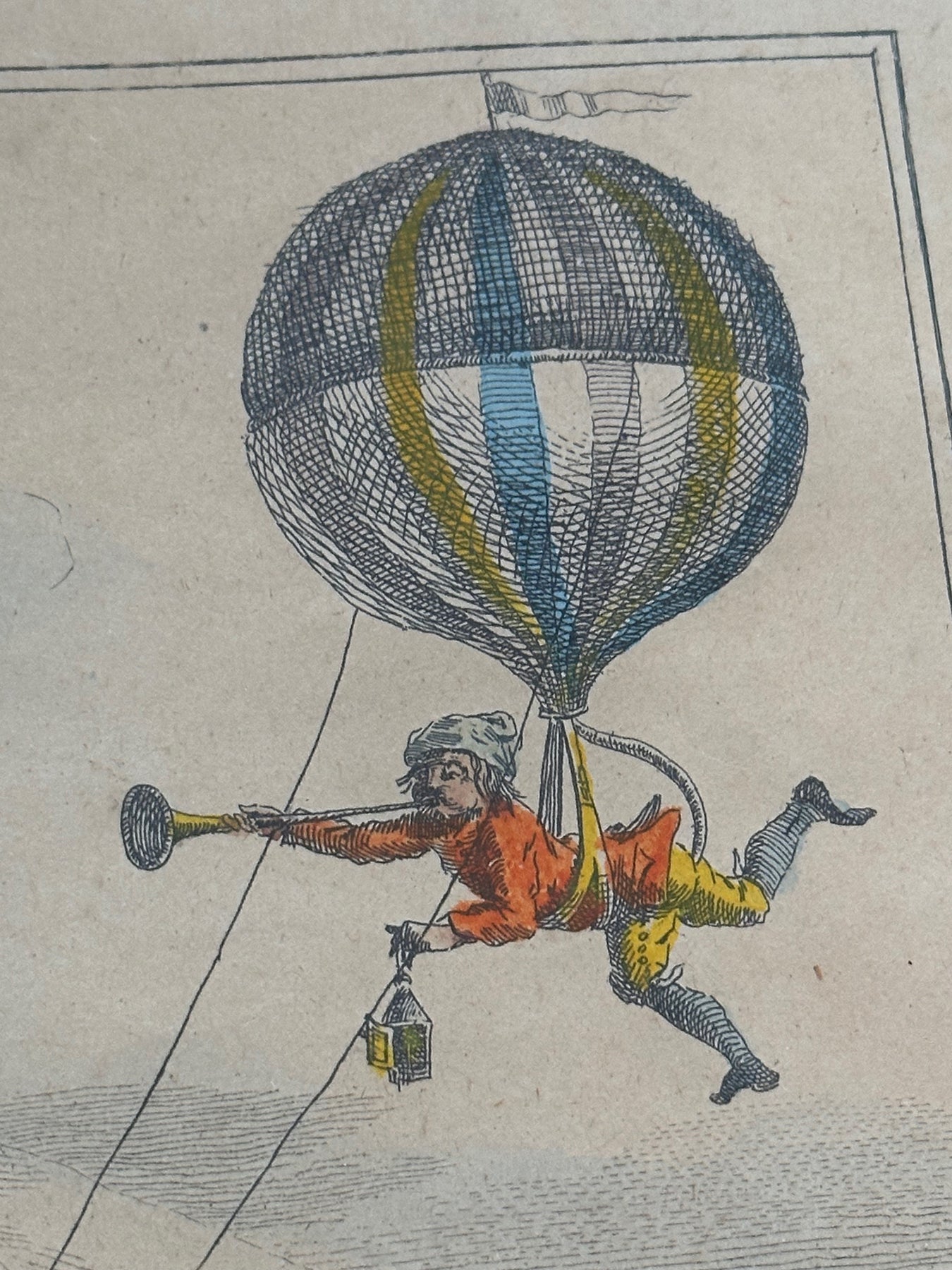 Witty commentaries on the aeronautical experiments that captivated Paris in the 1780s, with engraved verses below each scene. 18th-century vogue for ballooning satire, printed around the time of the first manned flights in France (1780s).