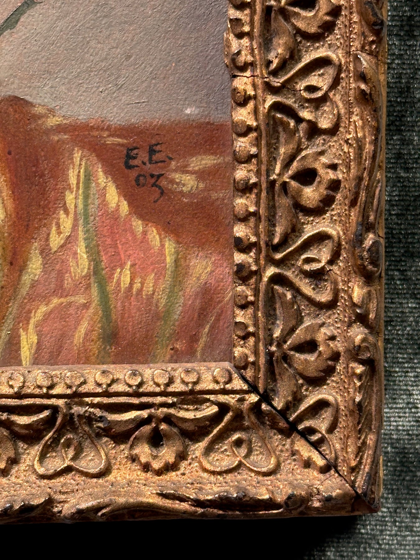 Delicate turn-of-the-century still life depicting a loose bouquet of chrysanthemum blooms in soft pinks, golds, and russets, arranged in a simple glass vase set atop a patterned textile and resting on a closed book. These blooms were a very popular subject in Victorian and Edwardian art, often symbolizing autumn, dignity, and transience. The muted background and gentle natural light give the composition a quiet, domestic intimacy. Despite its modest scale, the brushwork is assured, especially in the layered petals and shimmering reflections on the vase.