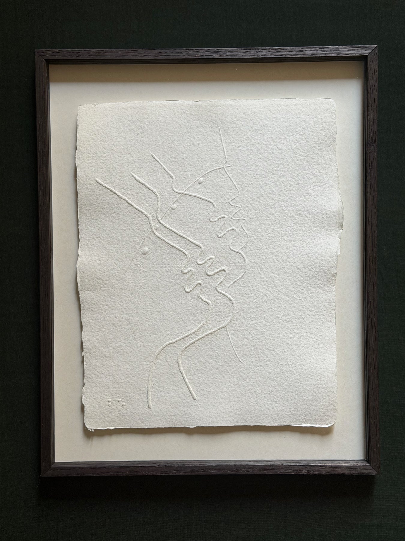 Blind-embossed woodcut on woven paper, depicting four interlocked profiles formed by a continuous linear relief. Published in 1992 by Éditions Les Yeux Ouverts in an edition of 1,000, supervised by Édouard Dermit as a tactile project for the visually impaired. Numbered in Braille at lower left. Wood frame