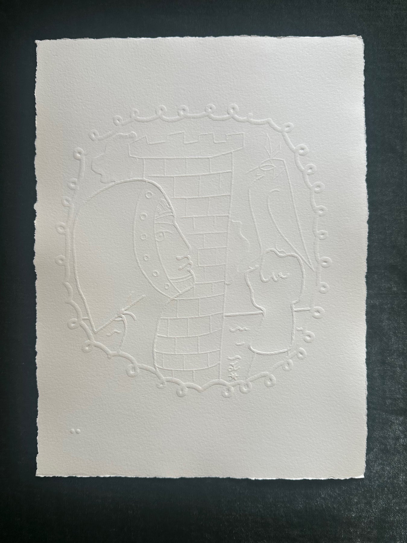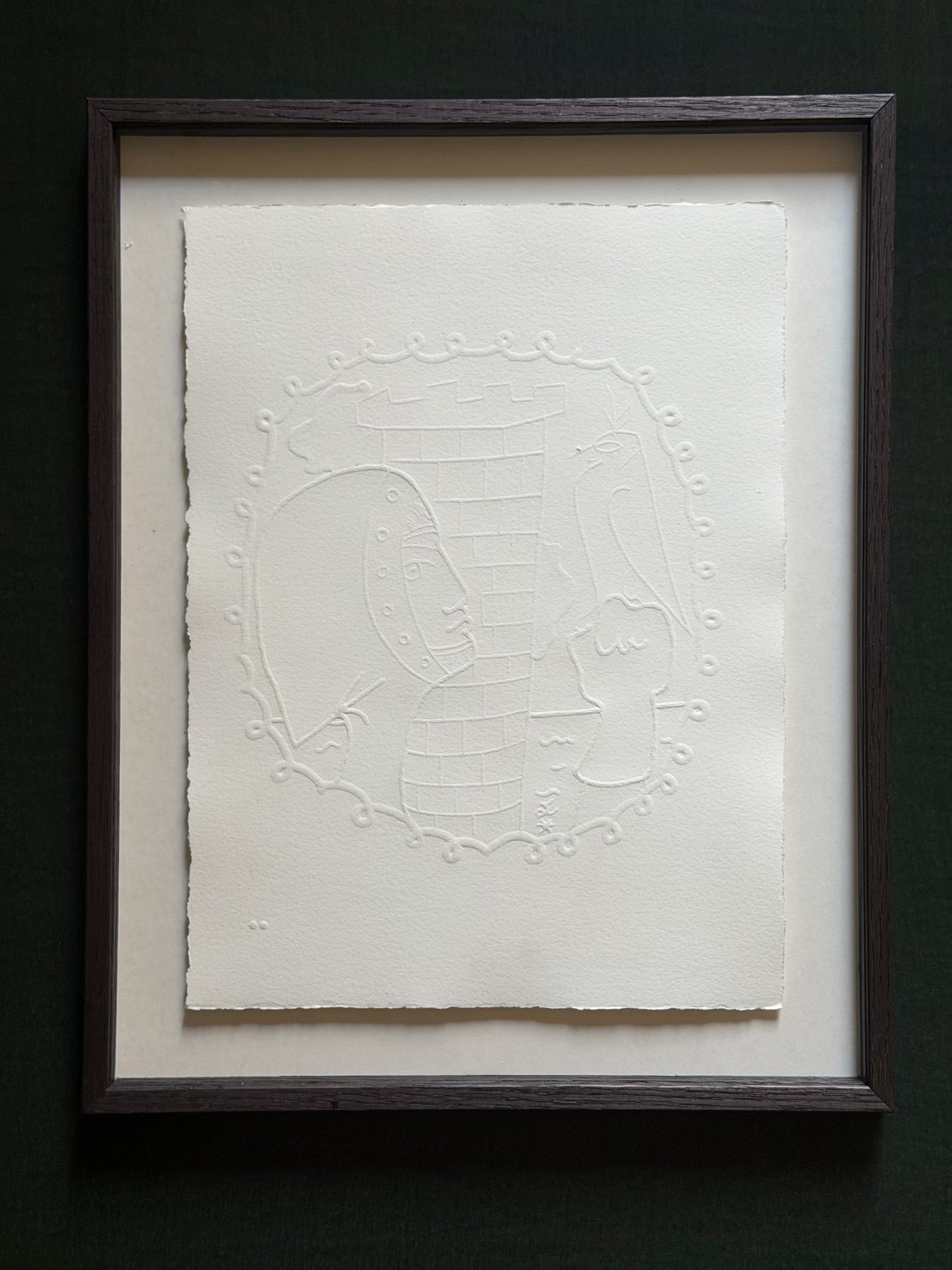 Blind-embossed print on woven paper showing a crowned profile before a crenellated tower, with a sea-figure at right and a bead-like circular border; Cocteau monogram embossed at lower center. Published 1992 under the supervision of Édouard Dermit for the tactile edition of 1,000. Braille numbering impressed at lower left. Wood frame.