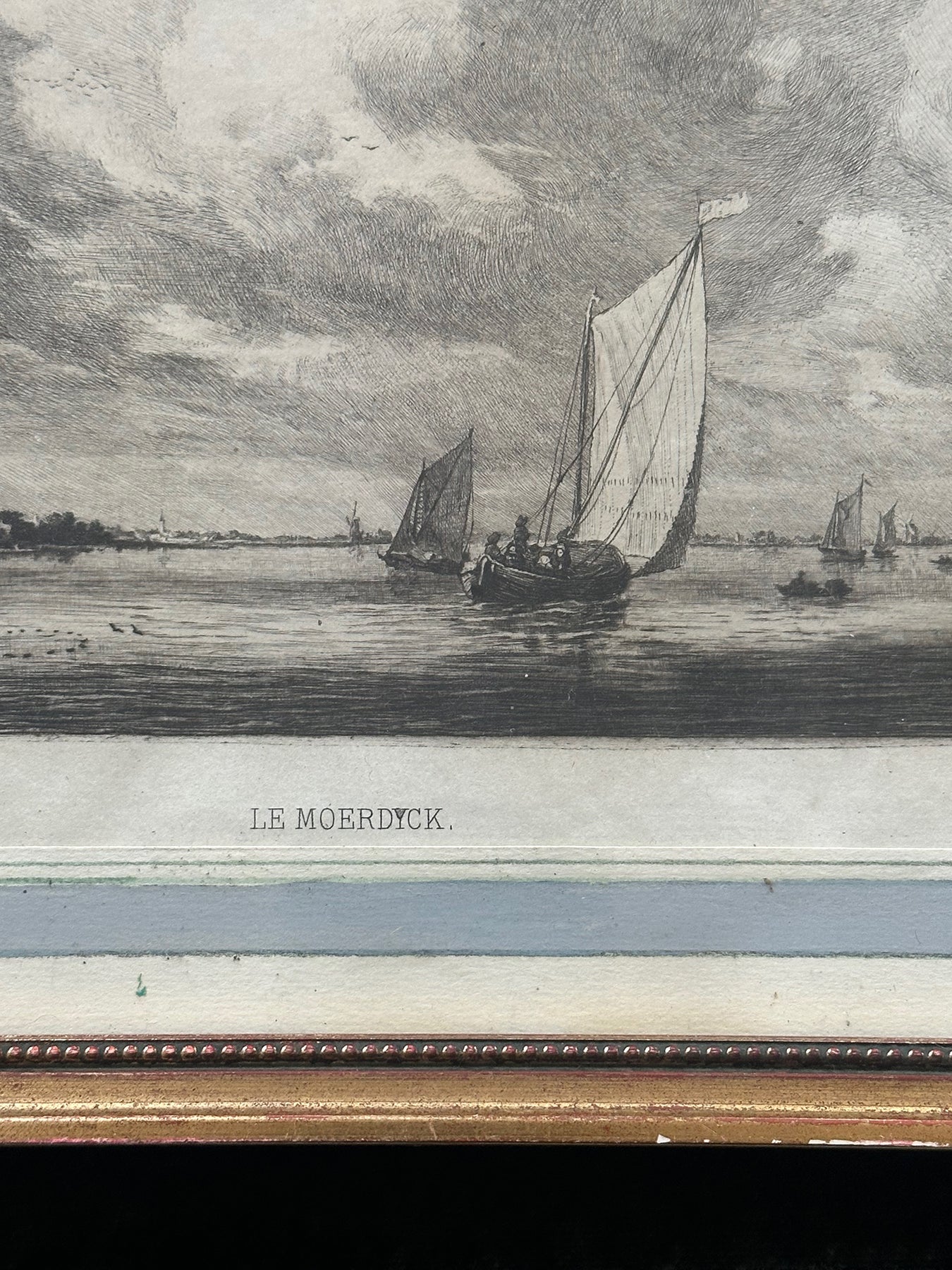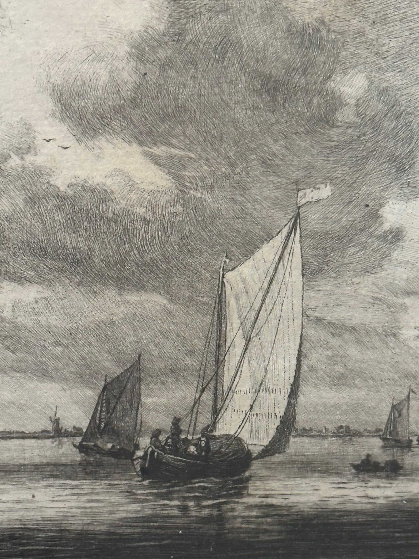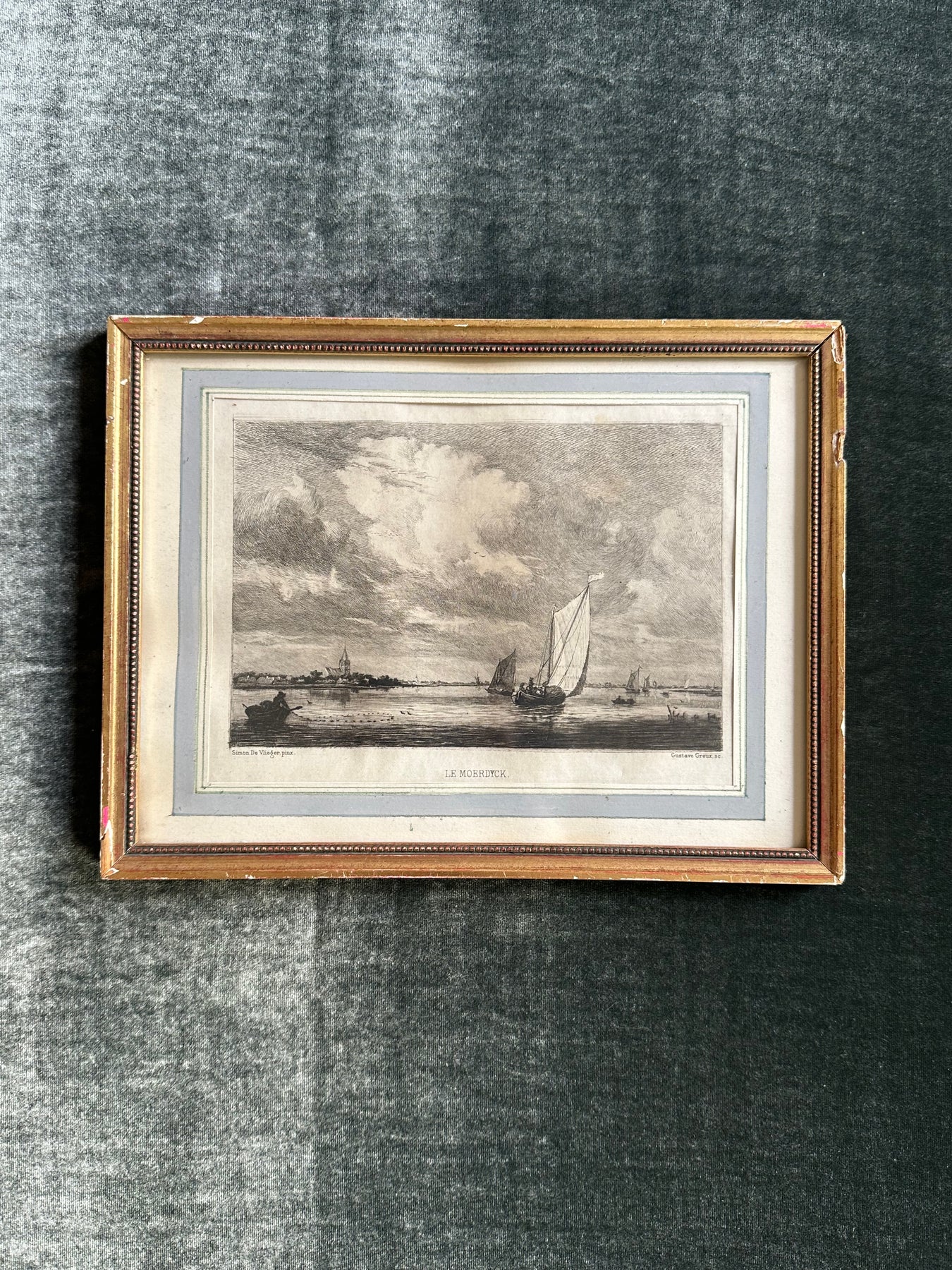 Fine 19th-century engraving by Gustave Greux after a marine painting by the Dutch Golden Age master Simon de Vlieger. The scene shows sailing craft gathered on calm water near the harbour of Moerdijk, beneath a vast clouded sky. Greux’s delicate needlework preserves the quiet atmosphere and soft reflections of the original 17th-century composition.