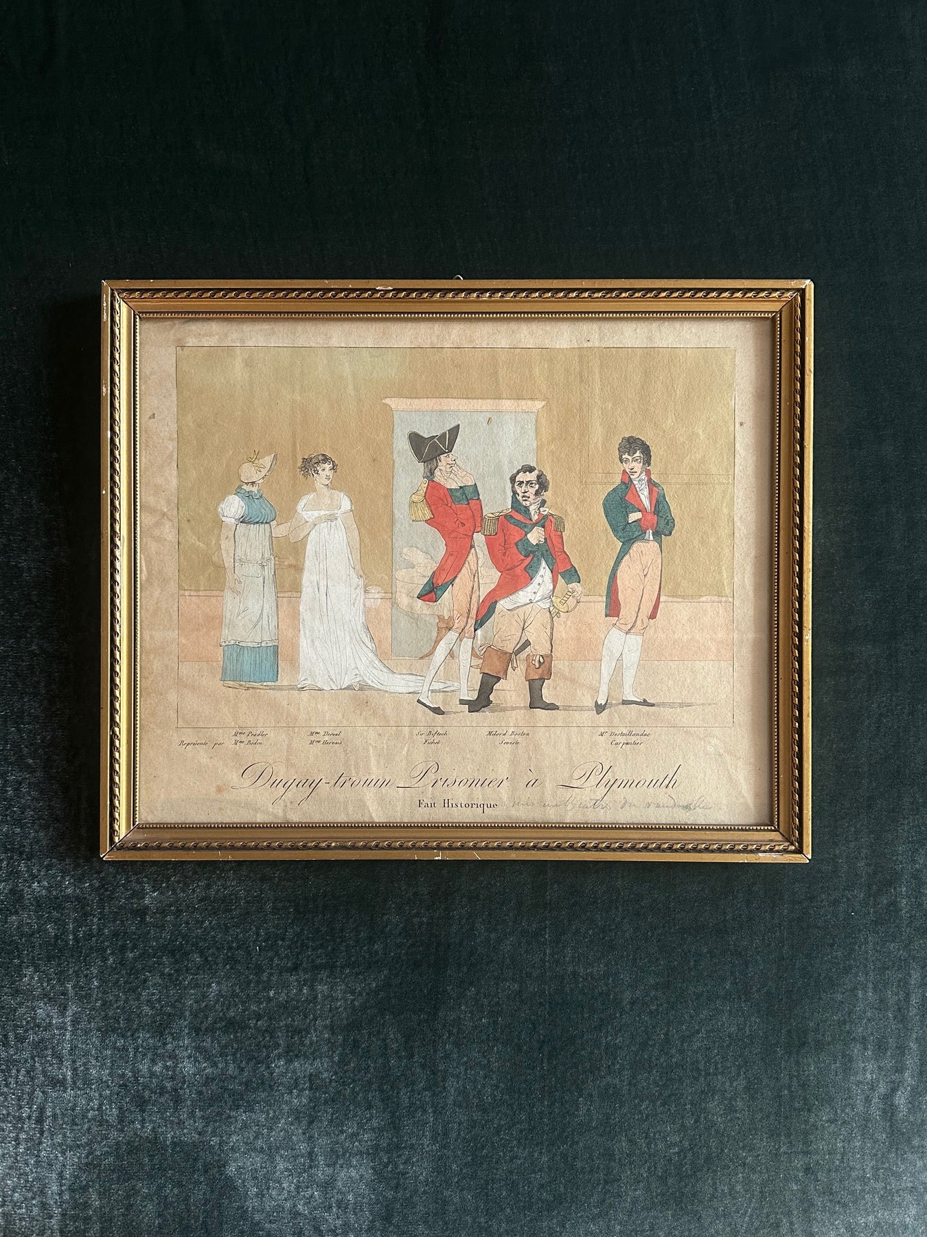 Witty Napoleonic-era satirical print depicting the supposed presentation of the French officer “Duguay-Troum” as a prisoner at Plymouth. The figures — two fashionably dressed ladies and three somewhat caricatured uniformed officers — are identified beneath the image as Sir Biftech, Milord Boston (severely built), and Mr. Detallinadas (carpenter), suggesting a playful jab at British manners and physique.
