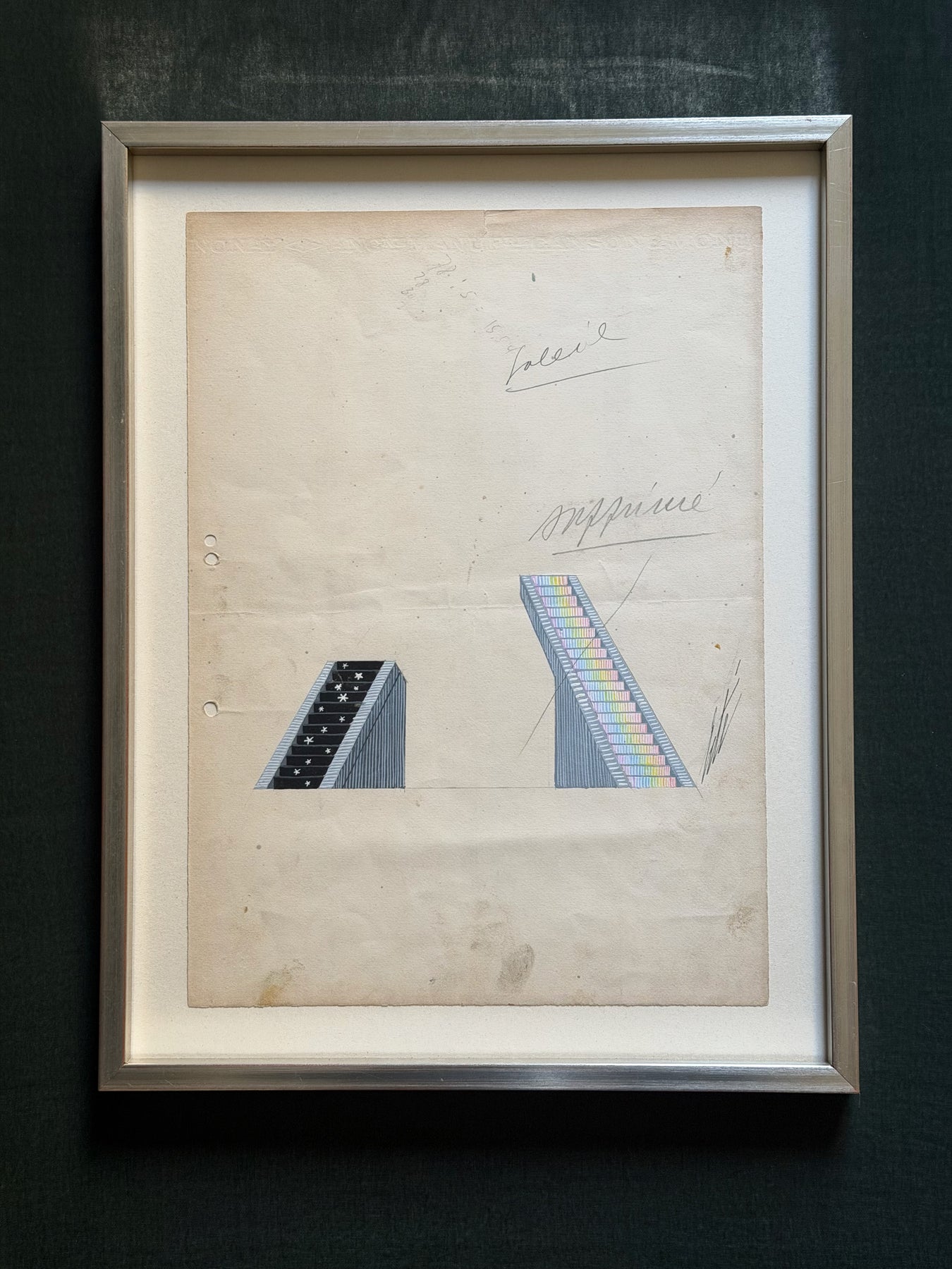 Three perforations on the left, overall good condition, with handling creases, scattered spots/toning, a horizontal soft fold, minor edge nicks, and two filing holes to one margin (corresponding holes to the other on verso). Image area stable, colors fresh. Wood frame.