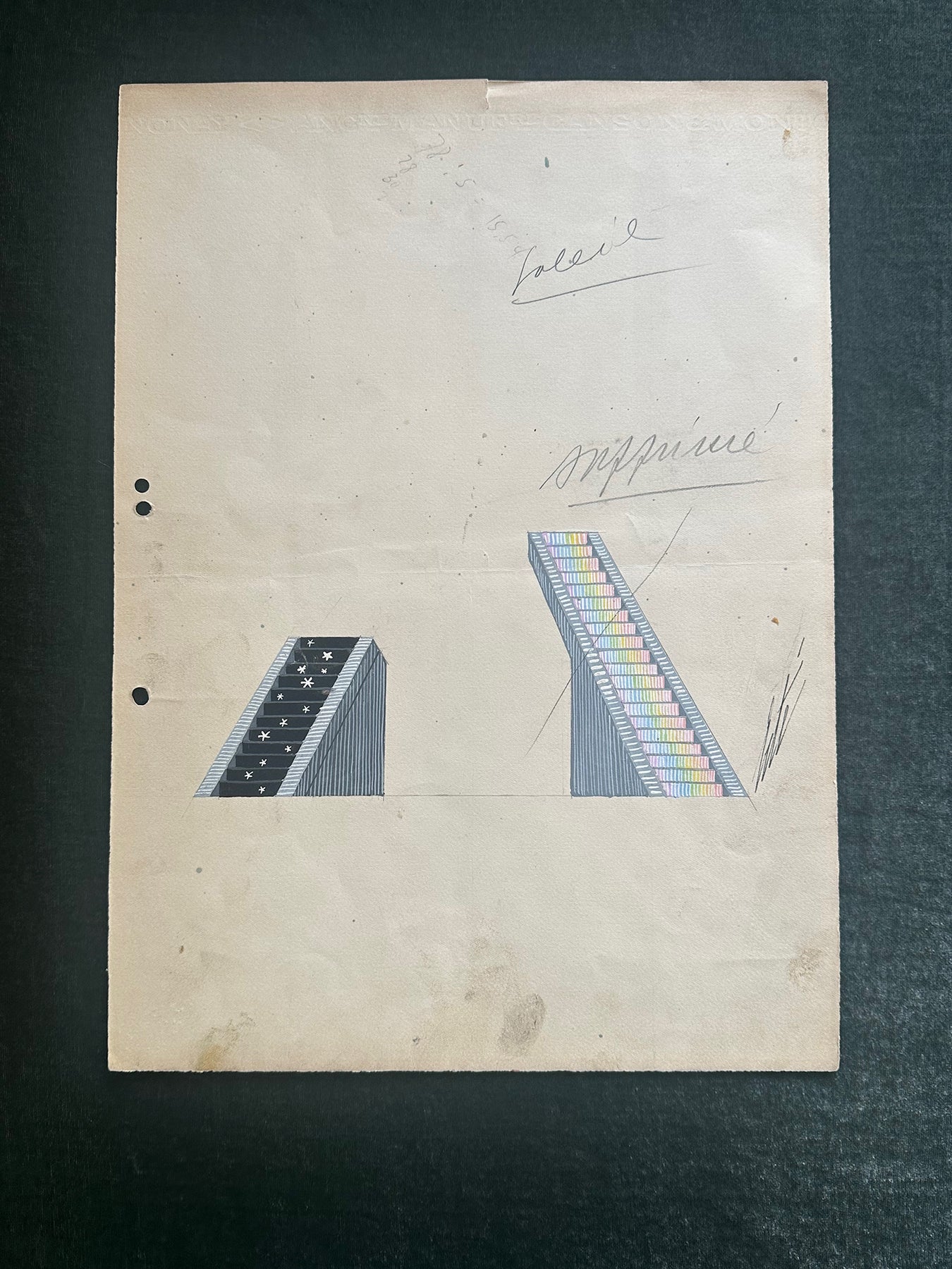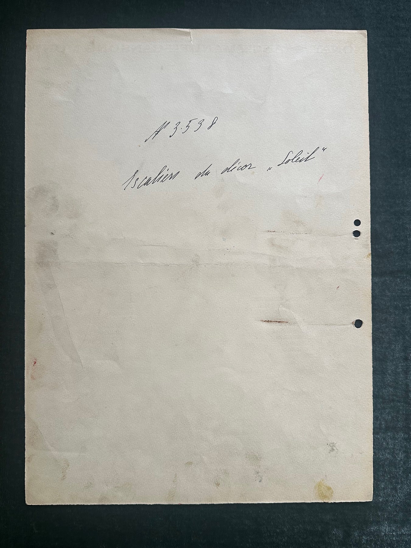 Working design sheet drawing for a theatrical set labeled Soleil, presenting two staircase variants: at left, black risers dotted with white stars; at right, polychrome banded risers. The starry version is crossed through in graphite; the word “Imprimé” appears beside the colored version.