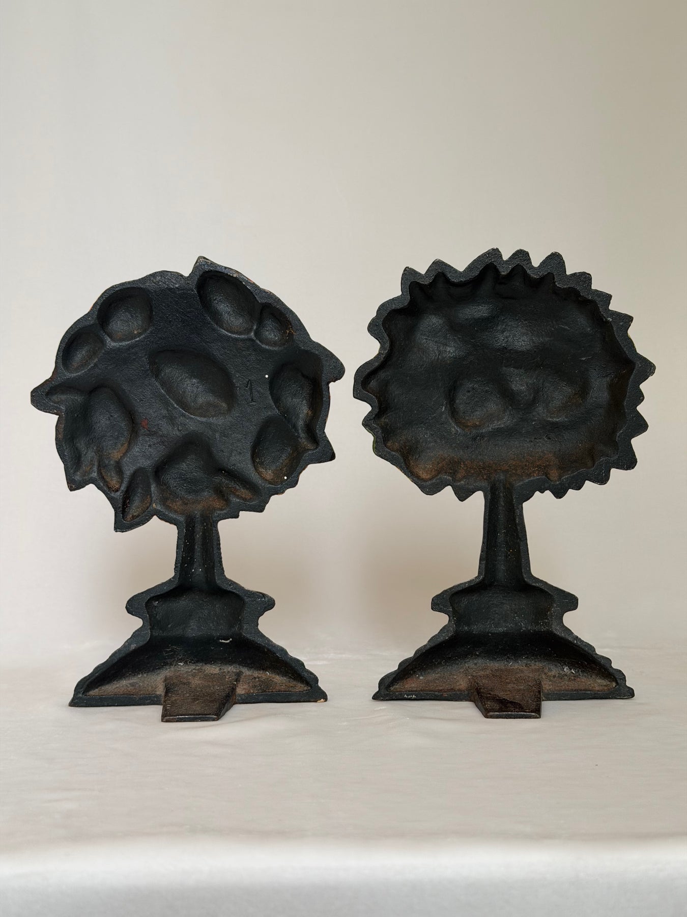 A delightful pair of cast-iron doorstops modeled as stylized fruiting topiary trees — one bearing oranges, the other lemons. Each piece is crisply cast and hand-painted in rich tones of green, citrus yellow, deep orange, and earthy brown. The sculptural forms are simplified yet expressive, with densely layered foliage and rounded fruit clusters rising from tapering trunks. The half-circular stepped bases — a practical shape designed to sit flush against a door — lend a subtle architectural presence, grounding the playful orchard motifs in the practical charm of early-20th-century domestic ironwork.