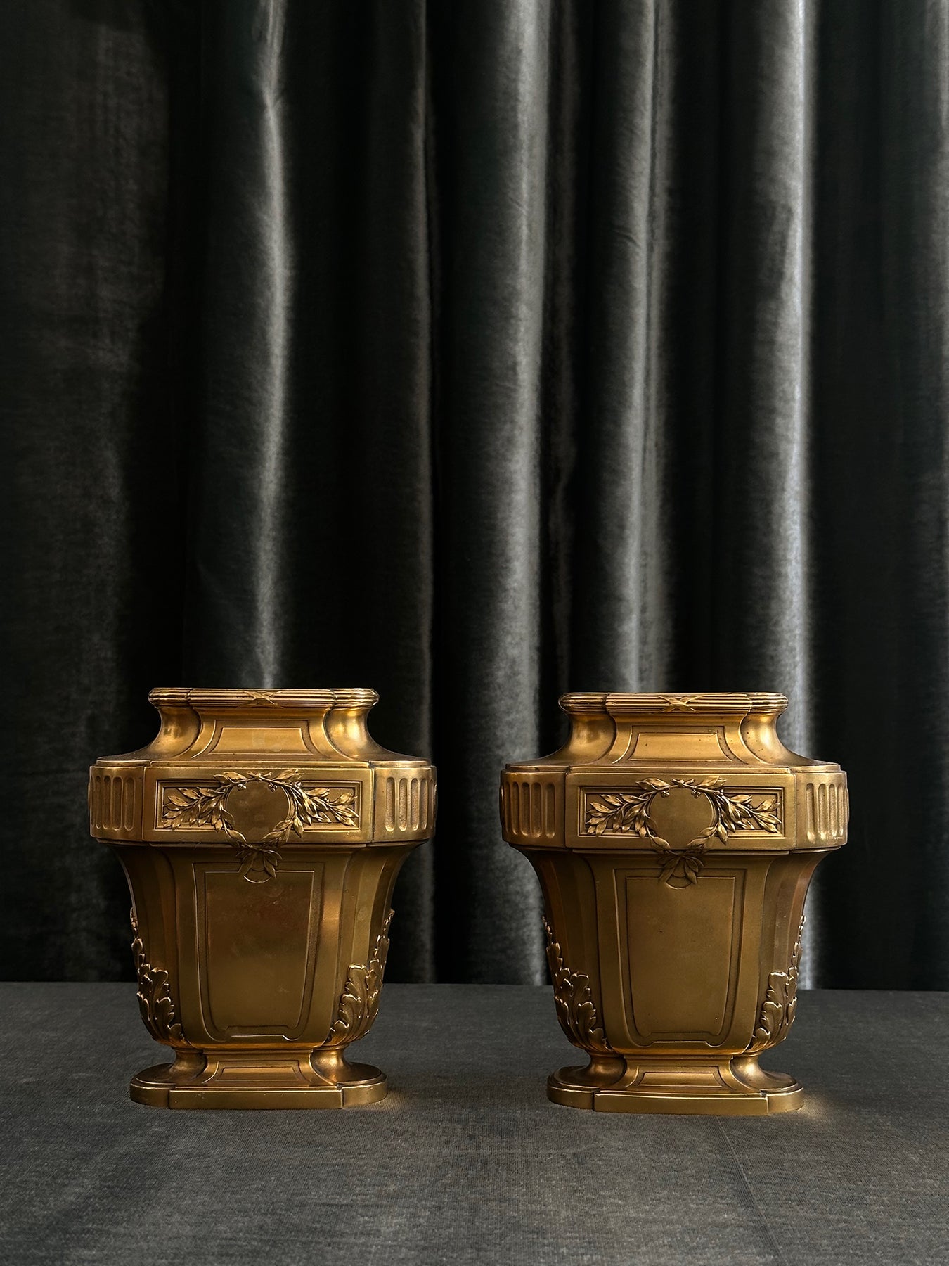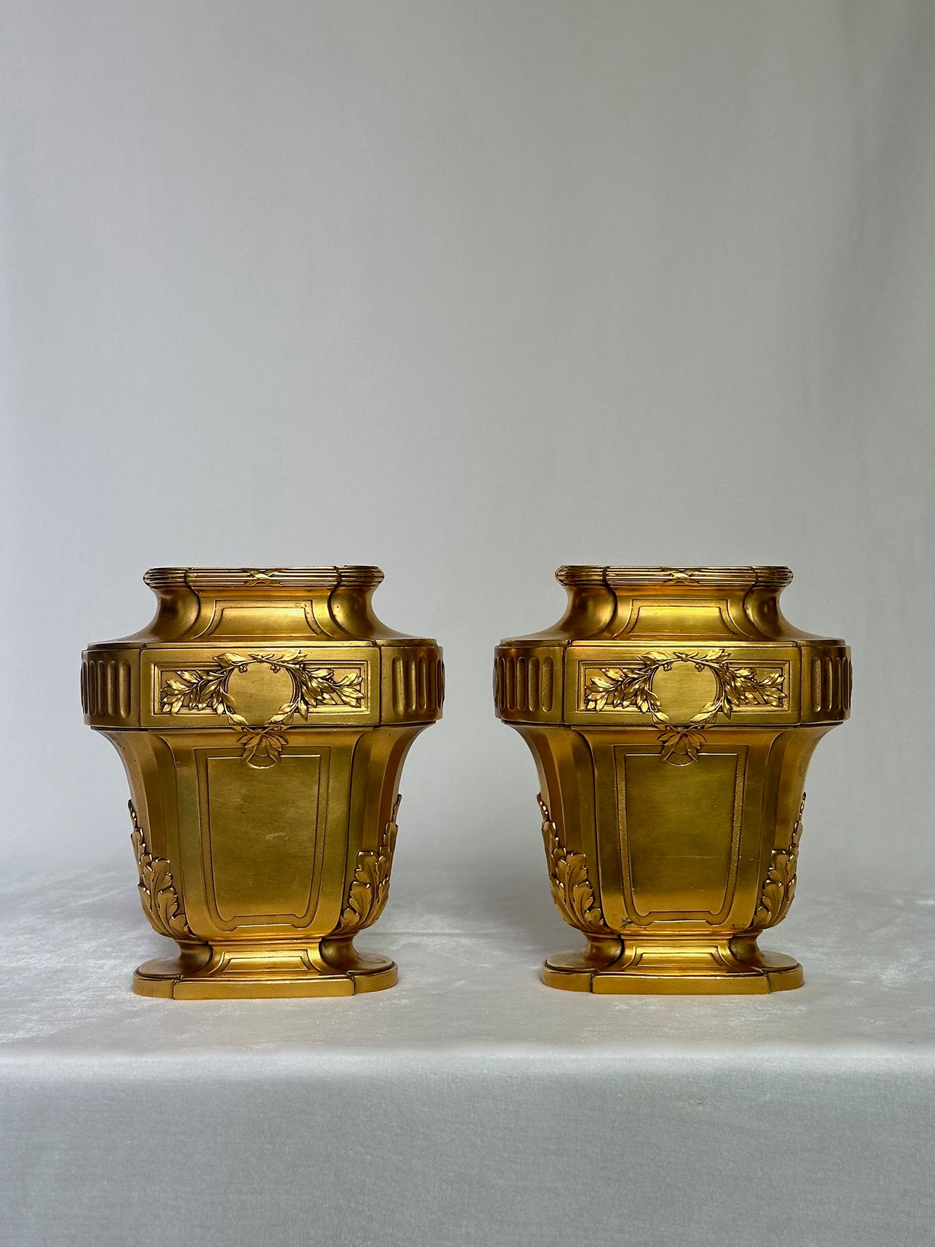 Each gilt metal vase of waisted form with a broad shoulder and flaring rim, the body panelled and framed with foliate swags and medallions in relief. Raised on a conforming oval foot. Stamped Gallia Metal with model number.