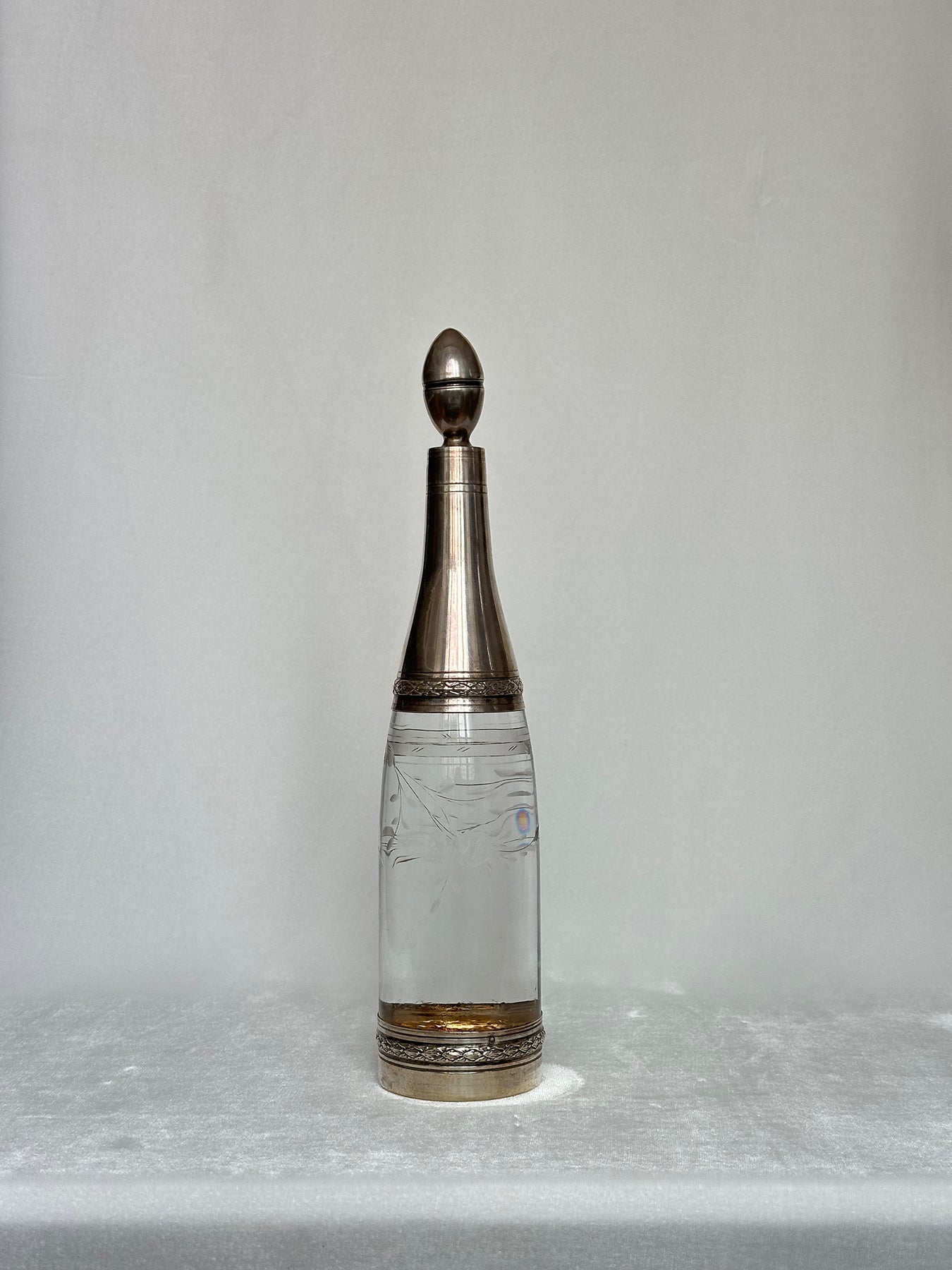 Clear blown glass, the body wheel-engraved with foliate sprays and a narrow band of stylized leaves near the shoulder. Fitted with silver mounts at the neck and base, each encircled by a chased laurel wreath band. The tall tapering neck terminates in an ovoid finial. French silver marks stamped on the mounts. Overall, the bottle sits at the intersection of Victorian neoclassical ornament and early Art Nouveau organic detail, giving it a refined, old-world apothecary or gentleman’s dressing-table presence. The compact scale, etched surface, and decorative metalwork suggest it was likely meant as a spirit flask not purely utilitarian but made to display and impress.