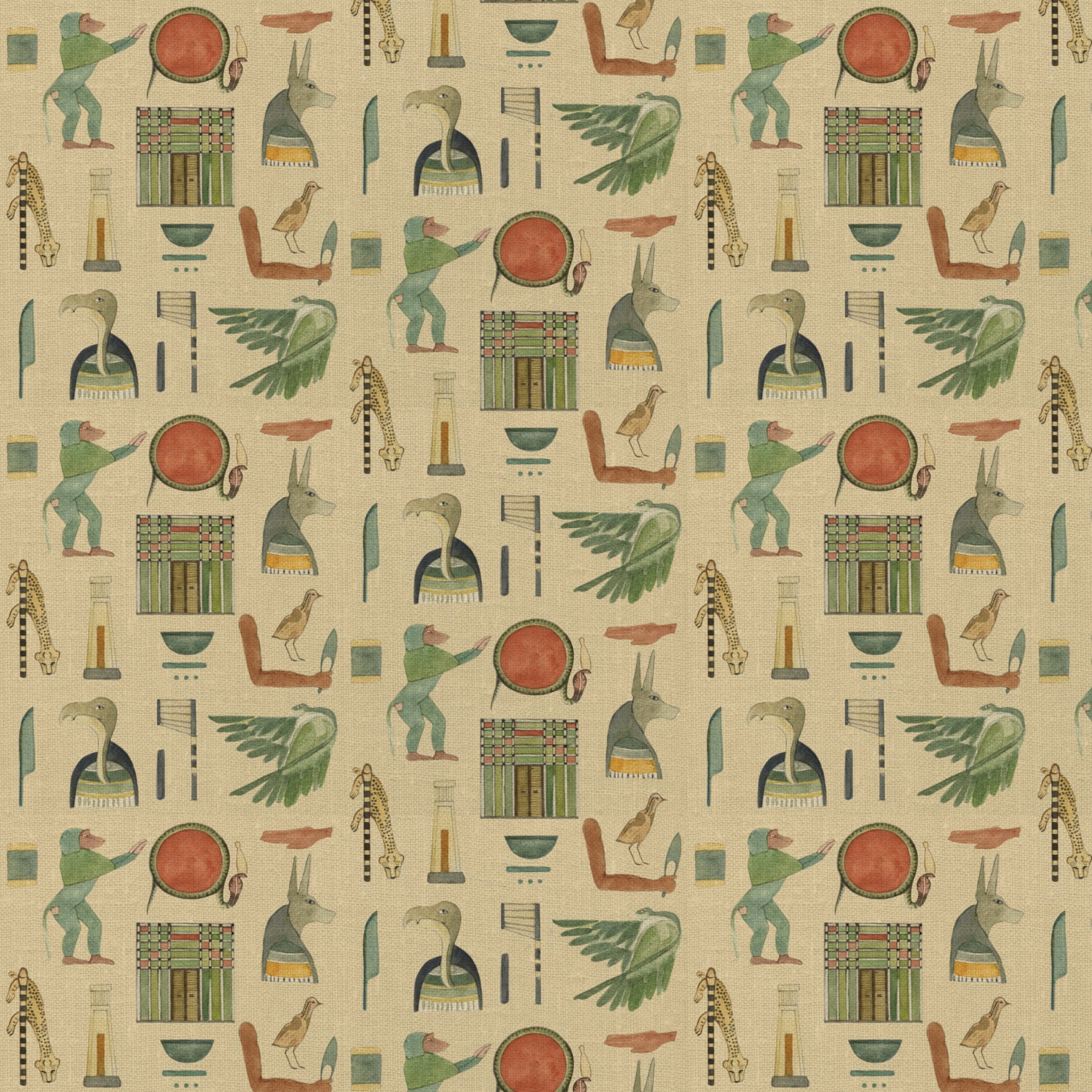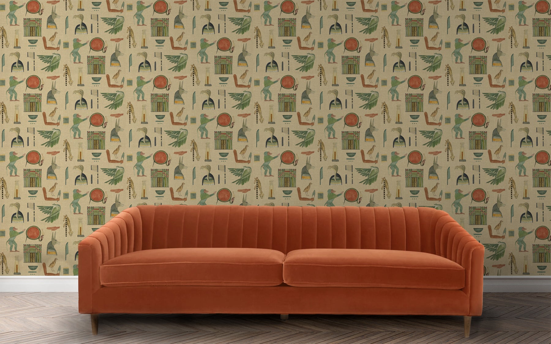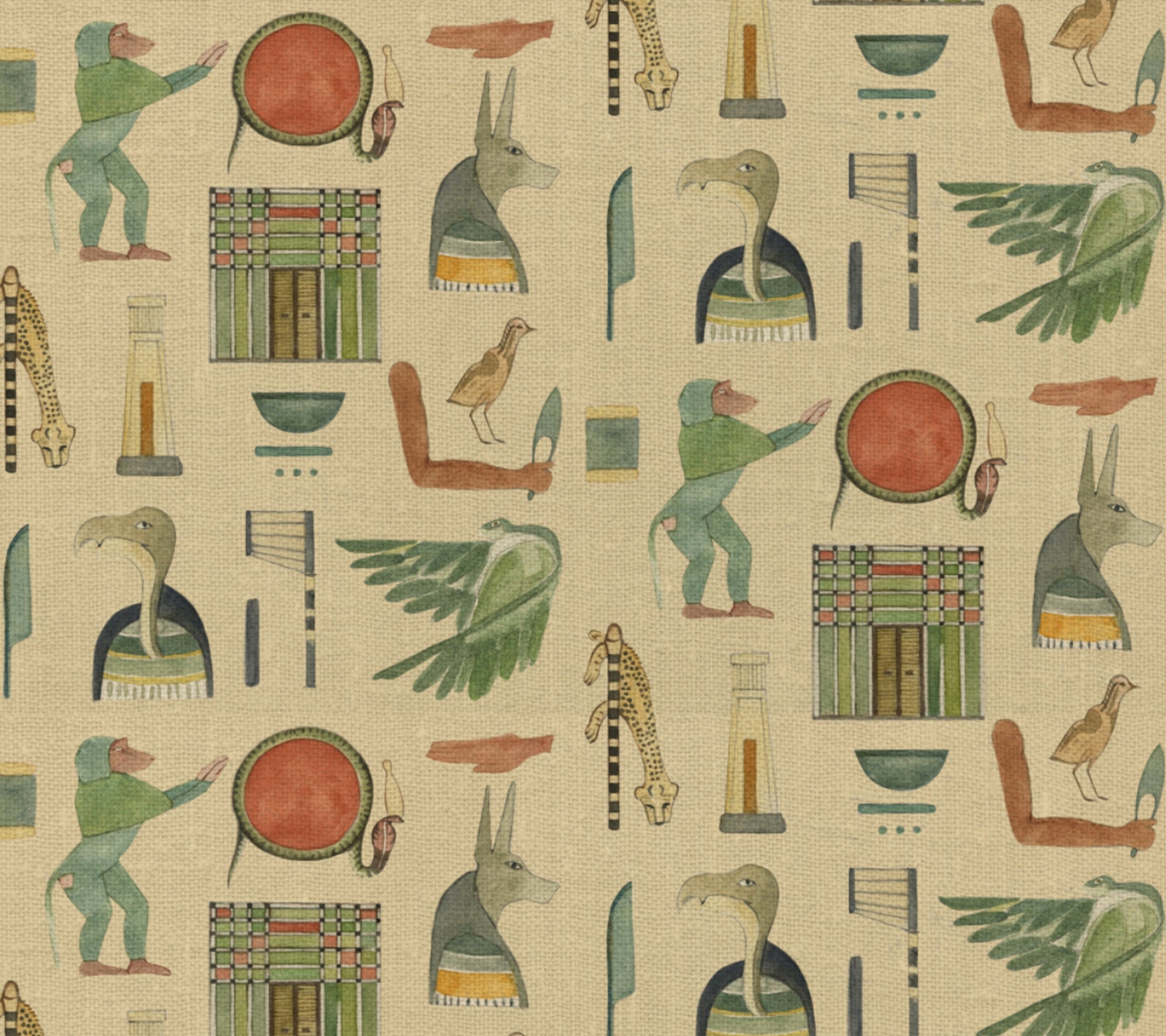 A regal mosaic of objects, animals, and monuments, the Anubis pattern is derived from Egyptian sarcophagal adornments. The hieroglyphic geometry, composed of baboons, vultures, jewels, towers and leopard scepters, also features the jackal-headed god of the afterlife, for which it is named. The ancient icons, copied from a sarcophagus at the Cleveland Museum of Art, are reborn in watercolor renderings arranged on a field of Onyx, Jade or Papyrus.
