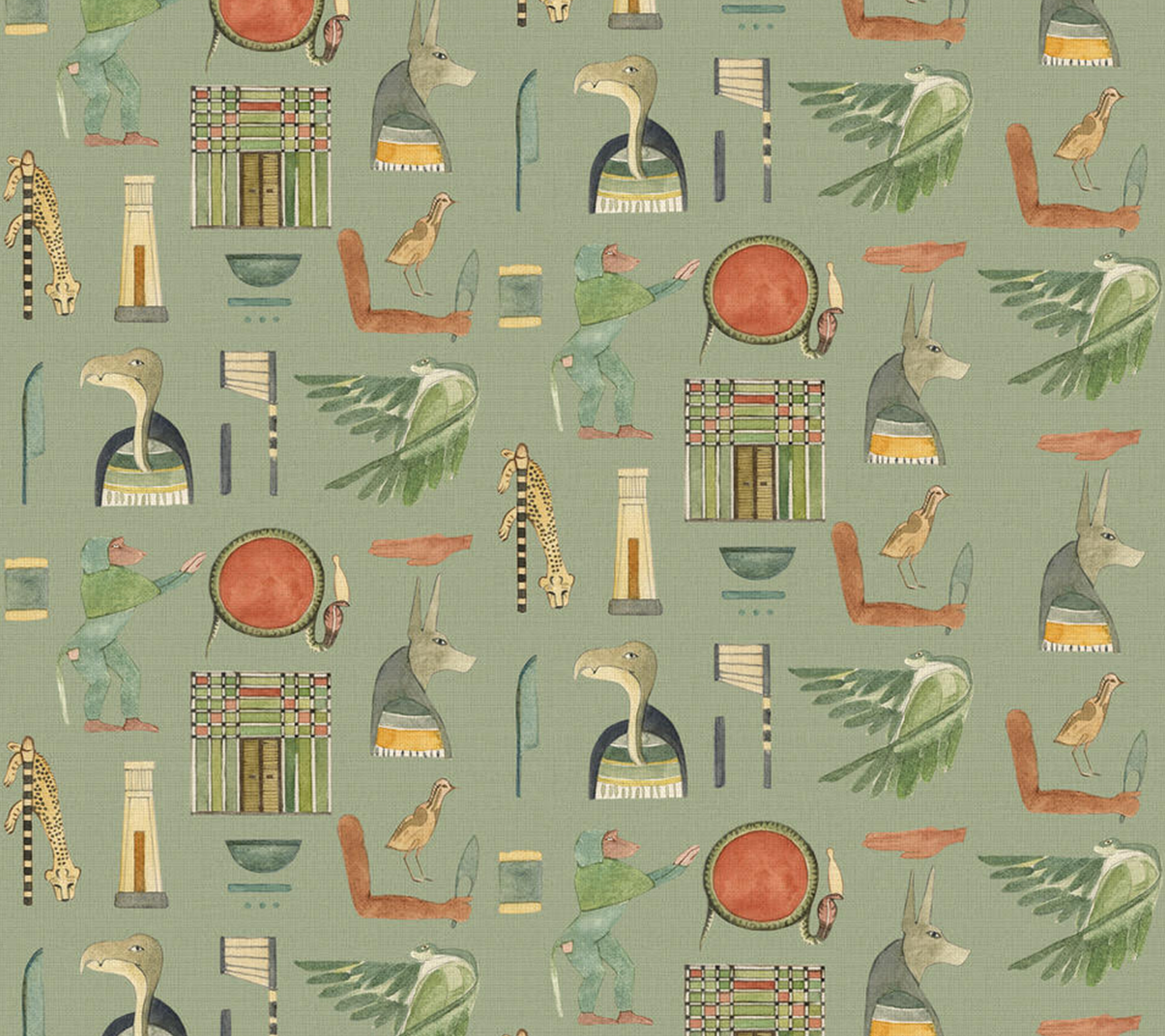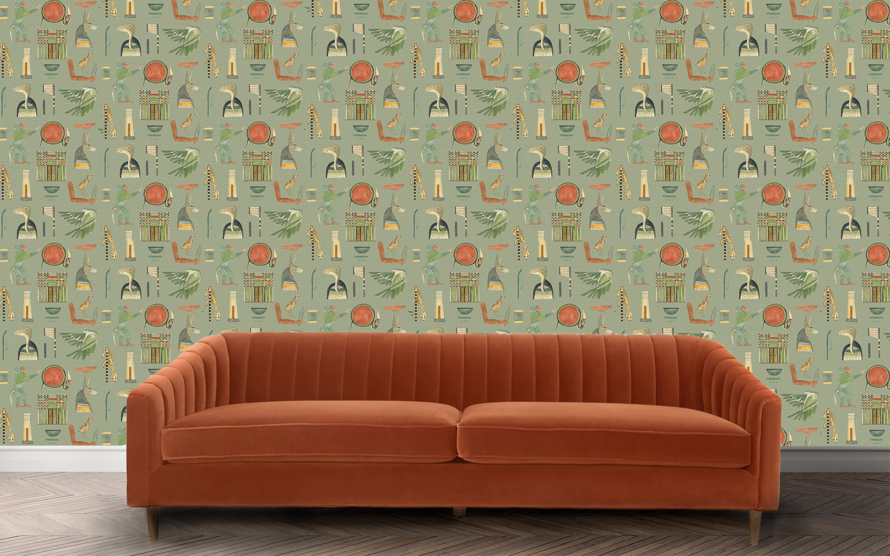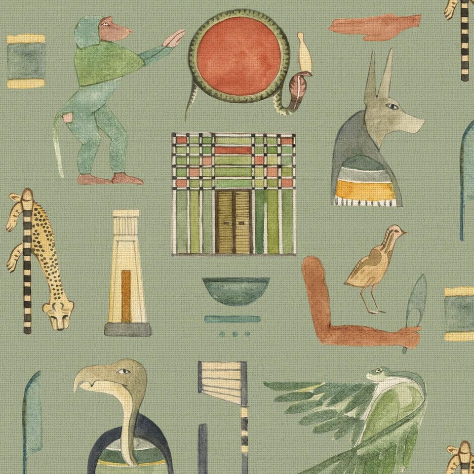 A regal mosaic of objects, animals, and monuments, the Anubis pattern is derived from Egyptian sarcophagal adornments. The hieroglyphic geometry, composed of baboons, vultures, jewels, towers and leopard scepters, also features the jackal-headed god of the afterlife, for which it is named. The ancient icons, copied from a sarcophagus at the Cleveland Museum of Art, are reborn in watercolor renderings arranged on a field of Onyx, Sage or Papyrus.