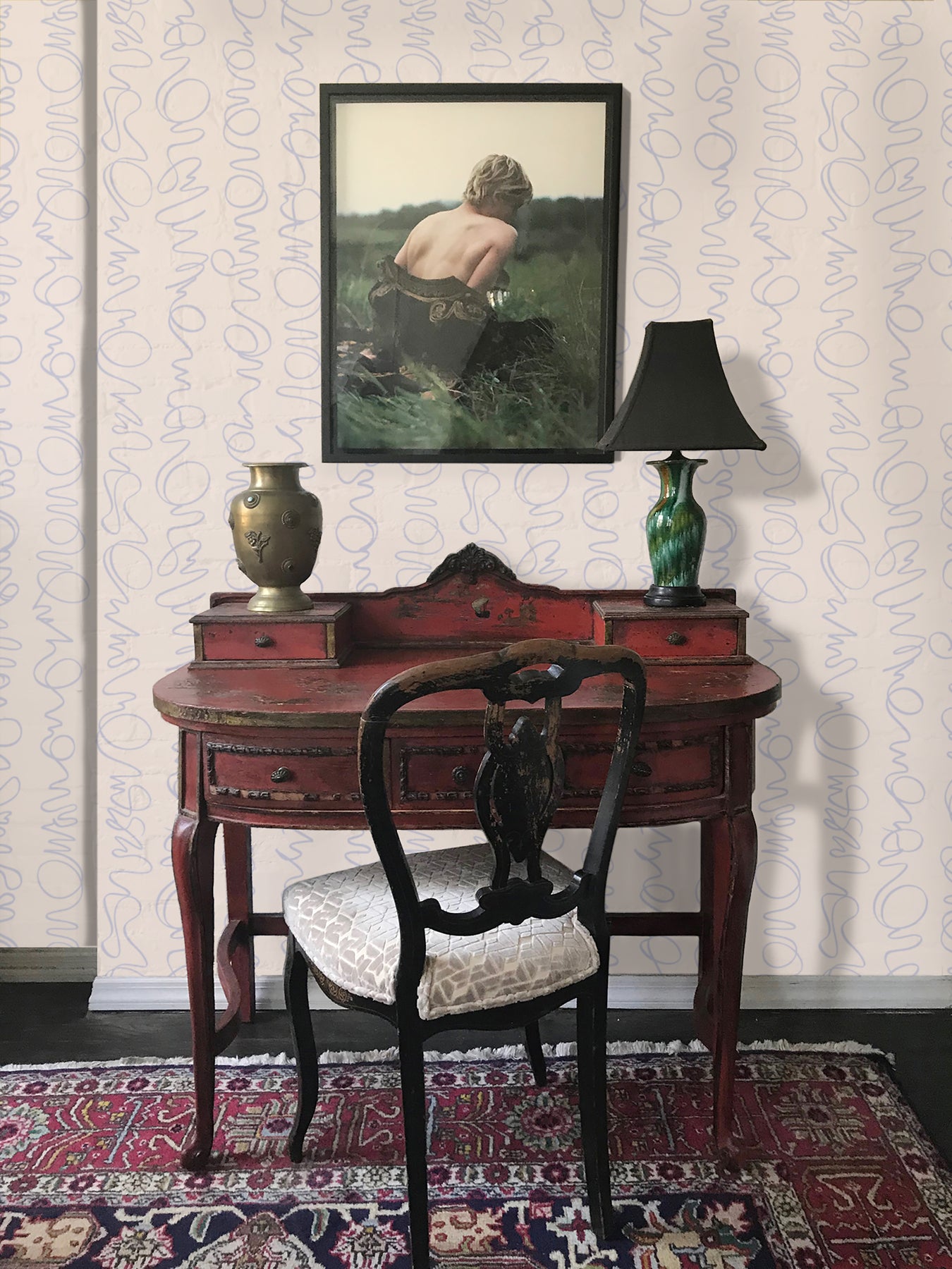 Dynamic and contemporary, Eunoia crackles with a vivacity that borders on punk. A vertical doodle races across the wall in a torrent of curlicues and strong brush-strokes, the pattern complements both modern and traditional decor. This energetic, improvisatory design transmits the personality and human touch of its hand-painted origins. Available in Indigo, Moss and Lilac.