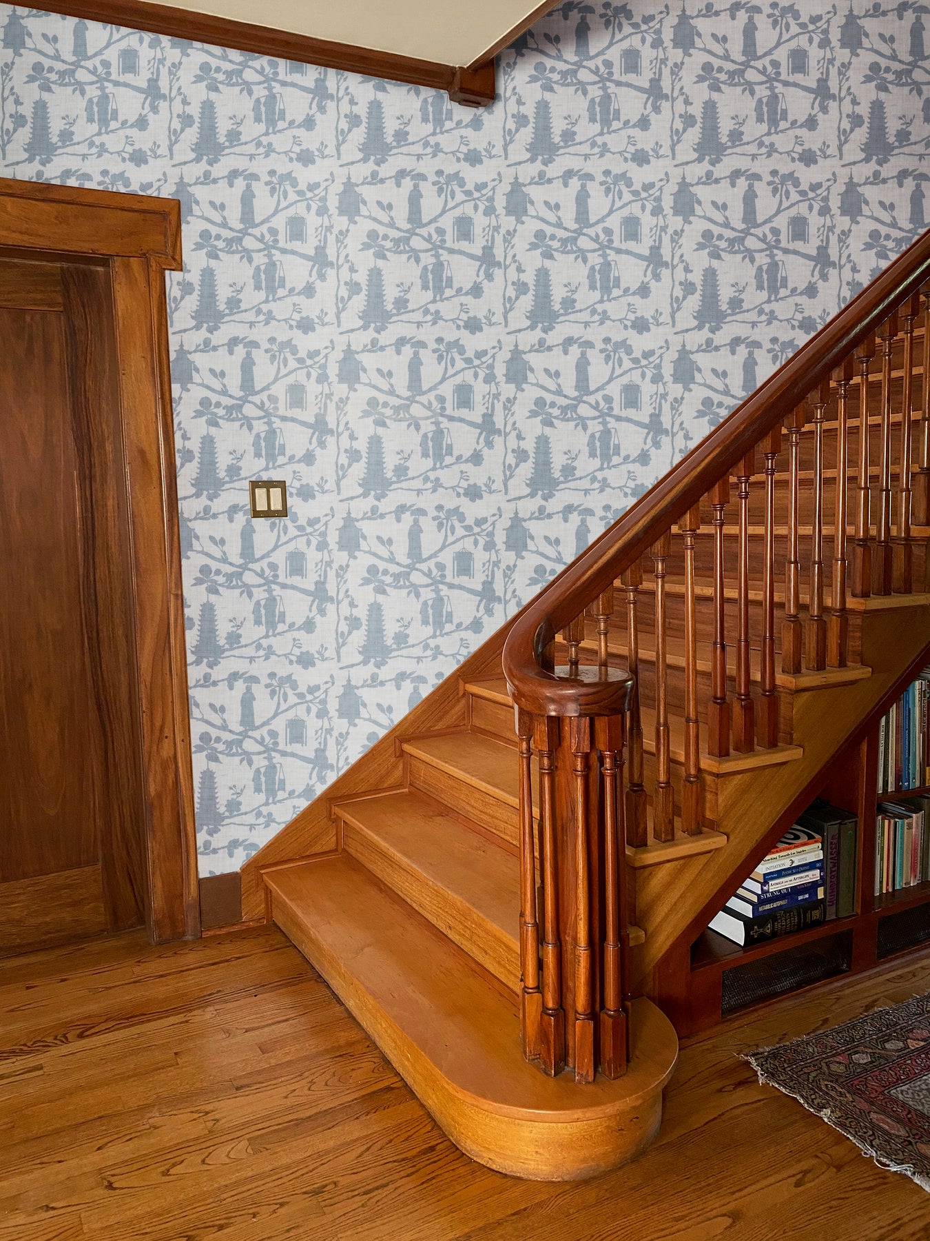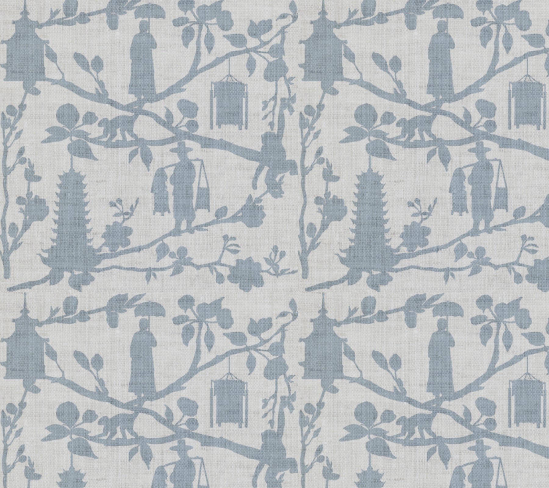 Traditional Chinoiserie is given a once-over in Harbin, a playful but refined take on a classic toile de jouy pattern. Tiered pagodas, dangling monkeys, rustic farmers and hanging lanterns mingle with a storybook simplicity against a field of flowering branches. This dual-tone silhouette motif is offered in Moss, Roseate or Dove.