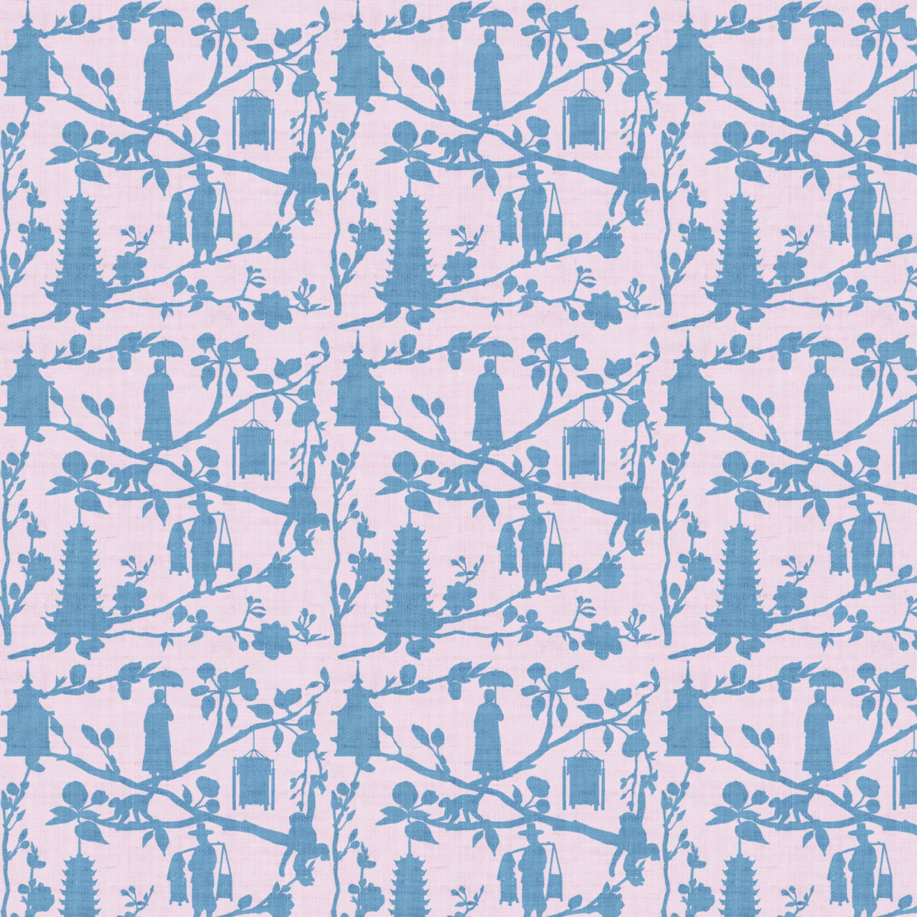 Traditional Chinoiserie is given a once-over in Harbin, a playful but refined take on a classic toile de jouy pattern. Tiered pagodas, dangling monkeys, rustic farmers and hanging lanterns mingle with a storybook simplicity against a field of flowering branches. This dual-tone silhouette motif is offered in Moss, Roseate or Dove.