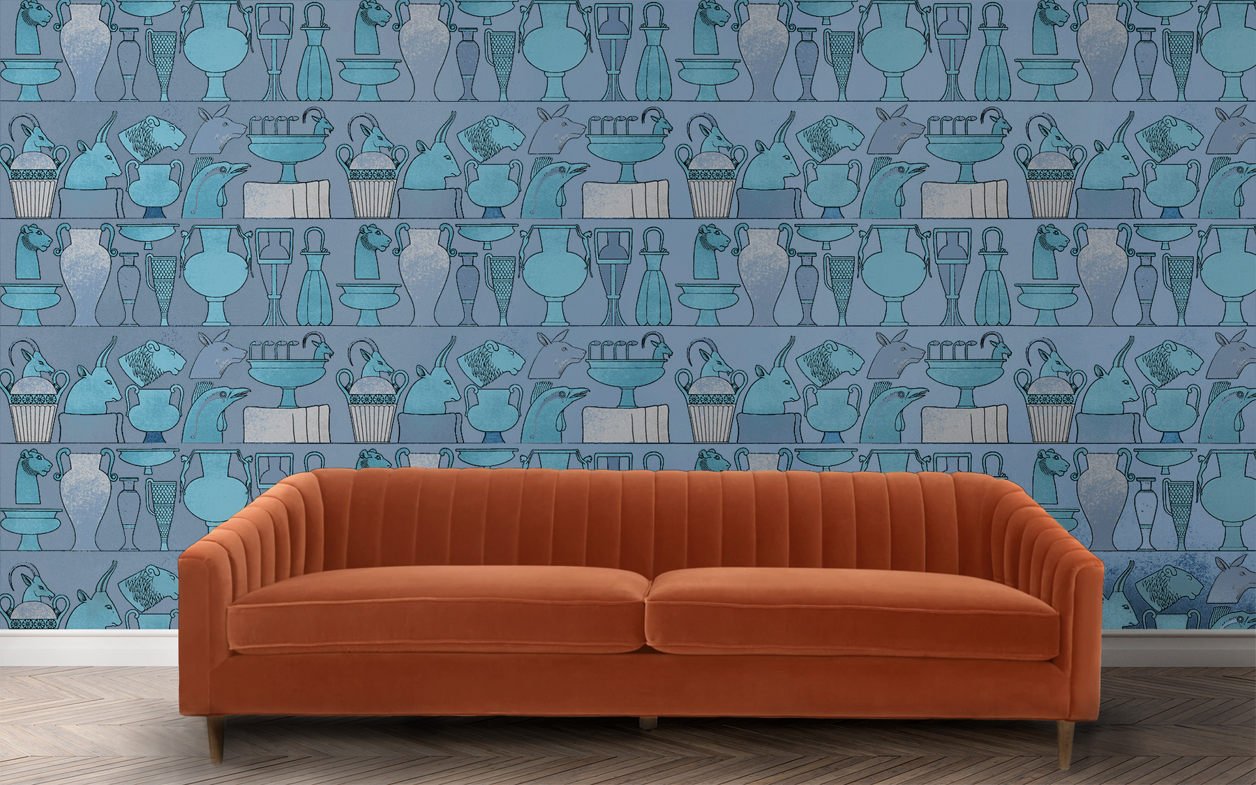 A sweeping collection of Egyptian pottery parades across the wall in Tut, a hieroglyphic ode to the cradle of civilization. Clay cylinders, bowls, and pitchers line up with animal-head vessels shaped like fish, lions and gazelles to create a backdrop that conjures both the stately history of a museum and the whimsy of a trompe-l’oeil. Available in Gold, Cerulean and Cocoa.